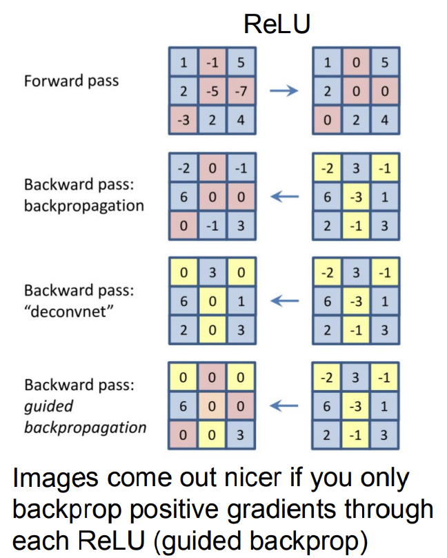 Guided Backpropagation도 위에서 본것과 마찬가지로 중간의 뉴런을 골라서 이미지의 어떤 patch가 영향을 크게 줬는지를 확인합니다.