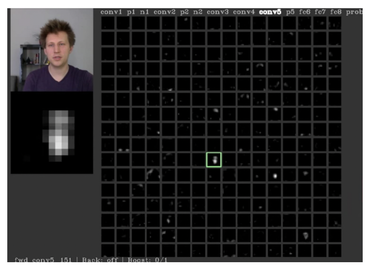 앞서 말했듯이 intermediate layer들은 input에 직접적으로 연결되어있는게 아니기 때문에 인간이 해석하기가 쉽지 않다고 했습니다. 하지만 얻어걸린건지 아닌지는 모르겠지만 AlexNet의 conv5 activation map에서, 사람사진을 입력했을때 얼굴의 모양과 위치가 비스무리한 image를 확인할 수 있었다고 합니다.