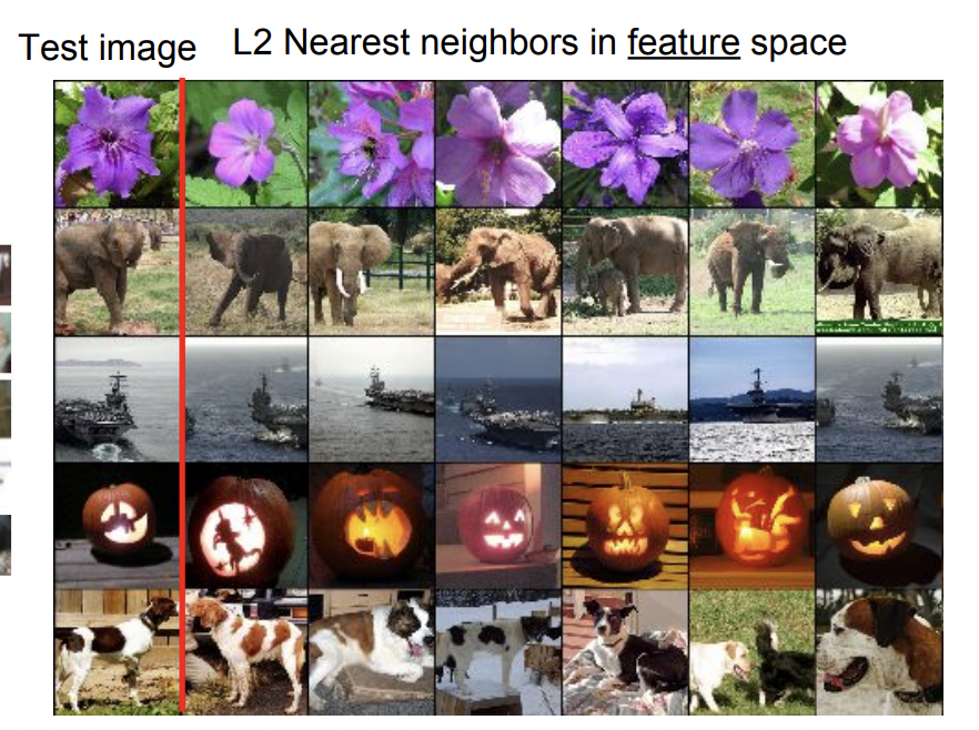 이렇게 input이미지부터 여러 layer를 거친 마지막 4096-D vector(=feature)들로 L2 Nearest Neighbor를 수행하면 비슷한 vector들끼리 묶이는데, 각 vector의 입력이미지를 모았더니 아래와 같은 결과가 나왔습니다.