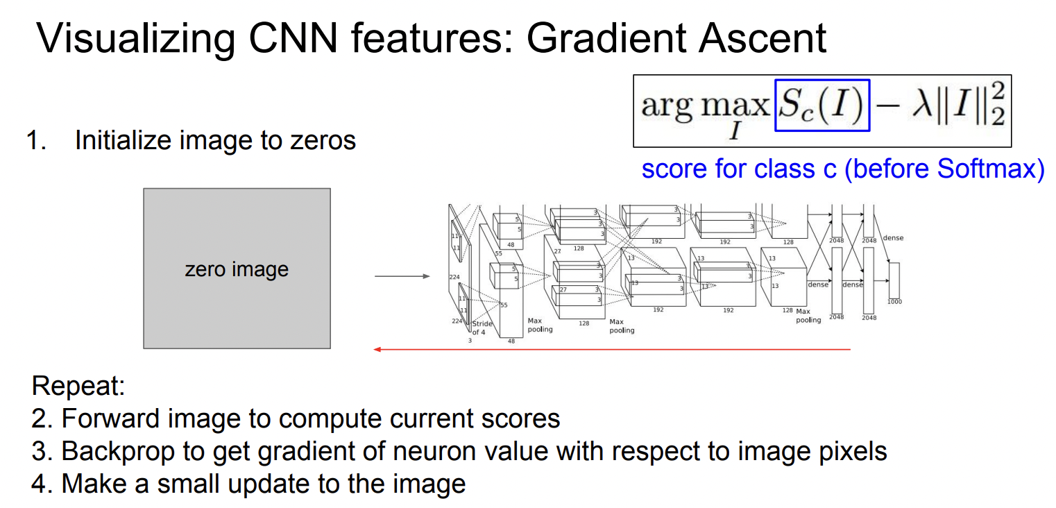 ※ 고정된 W에 대해 input image의 pixel value를 gradient ascent로 바꿔가면서 neuron이나 class score를 극대회 시키는것.