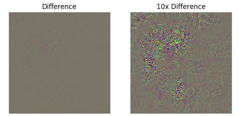 이 두 이미지의 pixelwise 차이(Difference)를 보면 큰 차이가 있지는 않습니다. 그러나 차이를 10배로 magnify하면 차이가 나타나지만, koala같은 모양이나 elephant같은 모양같이 의미있는 형태라기보단 노이즈가 보일 뿐입니다.
