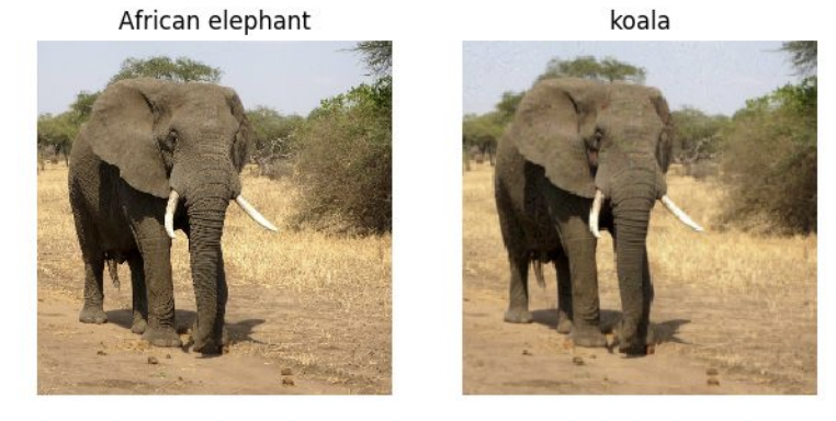 코끼리가 두마리 있습니다. 근데 왼쪽은 코끼리로 정확한 classification이 됐지만 오른쪽은 koala로 classify 됐네요.