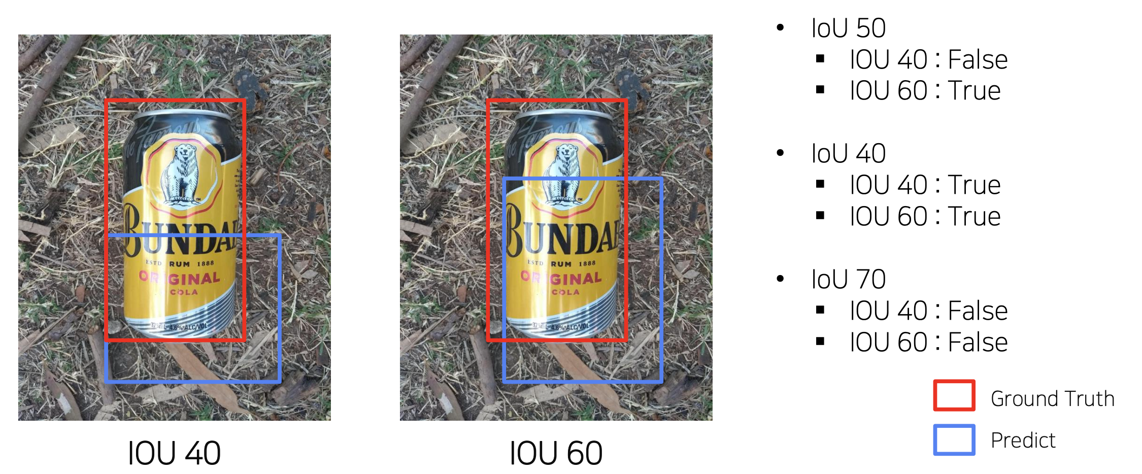 그림을 보면 이해가 쉬운데, IOU뒤에 있는 숫자가 GT와 겹치는 정도를 퍼센트로 나타낸 것입니다.