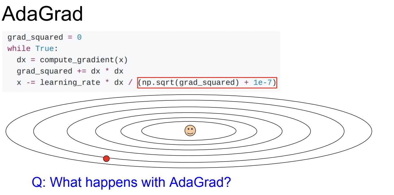 - SGD의 문제 - 만약 W가 w1,w2의 2차원 형태일때, w1의 변화에는 둔감하게 반응하고 w2의 변화에는 민감하게 loss가 반응할때→ 이거는 한 예시일뿐이고 실제로 loss function은 타코셸 모양으로 특정 방향으로 이동하는게 더 민감할 수가 있다 (??무슨소리지) // lecture note 참고