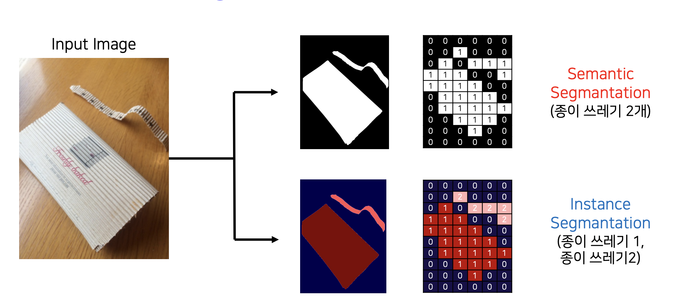 Semantic Segmentation은 각 pixel 단위로 classification을 한다. 왼쪽 이미지와 같이 '종이 쓰레기'를 분류하고 싶을 때 어떤 픽셀이 어떤 class인지 모든 pixel에 대하여 라벨링 한다.