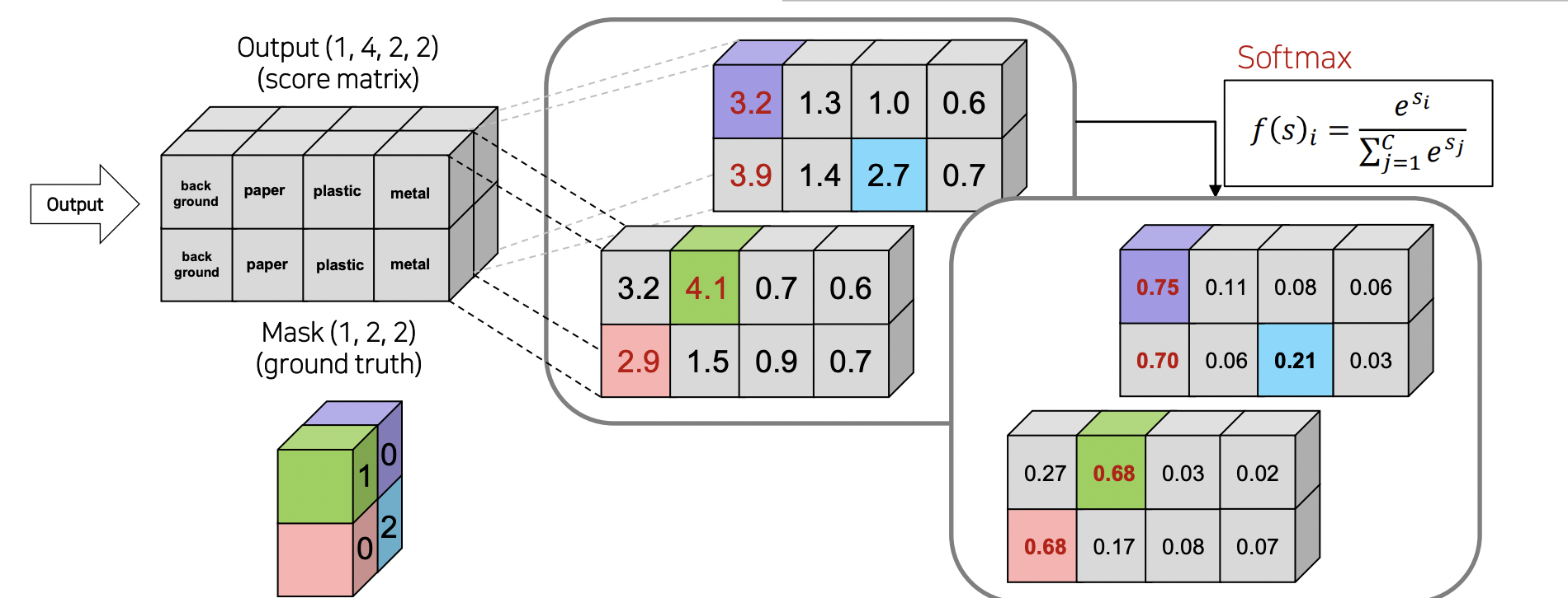 각 pixel 별 cross entopy loss를 계산하고 그 다음에 softmax를 적용해서 최종 output을 계산한다.