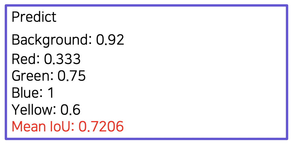 위와 같이 모든 class에 대한 IOU를 구한 뒤 mIOU를 구하면 왼쪽과 같다.