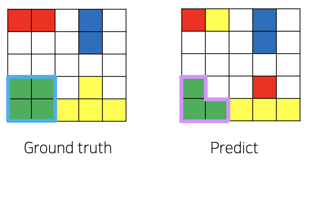 : GT에서의 빨강=2개 + Predict에서의 빨강=2개 - GT와 Pred 교집합=1개 = 3