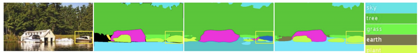 하지만 왼쪽에서 세번째, FCN의 결과를 보면 가장 오른쪽의 보트가 자동차(남색)으로 인식되었음을 확인 할 수 있다.